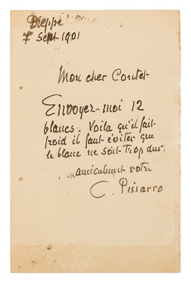 1 page, 8vo, some ink smudges (mostly at upper left affecting address and date), pinholes along left margin, toned at bottom. Pissarro ordering paint from is supplier: "Send me 12 whites. If it is cold you must avoid that the white not be too hard."