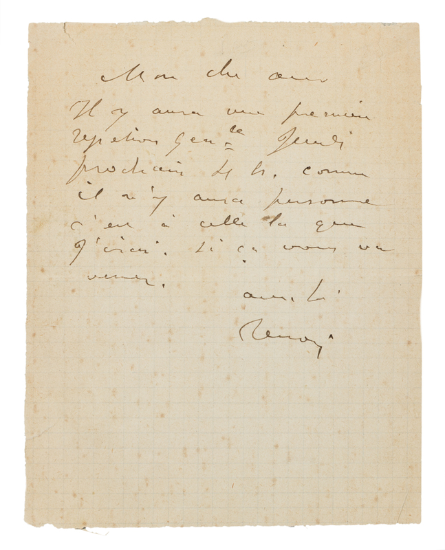1 page, 12mo, some light spotting. Renoir tells his friend of his plans to attend a dress rehearsal the following week, and invites him to attend. 'My dear friend...as there won't be anyone [at the dress rehearsal], that's the one I will attend. If it appeals to you, come along."