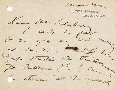 1 1/4 page, 12mo (90 x 115 mm), on a Tite Street correspondence card, two small holes punched in left margin, affecting one word of text, slight mounting remains on verso, slight ink smudge to one word. Regarding a sitting. Sargent settled in London, taking over Whistler's former rooms on Tite Street, after the controversy of his portrait of Madame Gautreau in Paris in 1884.