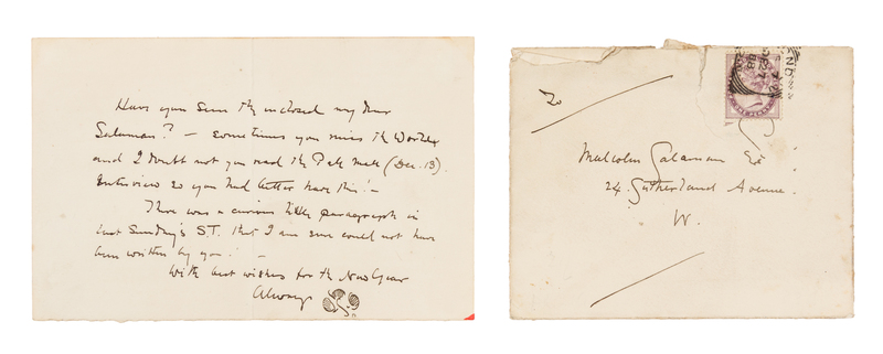 1 page, oblong 8vo, with original addressed stamped and postmarked envelope, traces of mounting on blank verso, slightly creased, small red mark lower right corner. Malcolm Salaman (1855-1940) was the art and drama critic of the Sunday Times, and was on the staff of The Graphic. He wrote a number of books and articles about art and art history, including The Great Painter-Etchers, from Rembrandt to Whistler (1913). Whistler writes: "Have you seen the enclosed my dear Salaman? [presumably an article, not present here] - Sometimes you miss The World and I doubt not you read the Pall Mall (Dec. 13) Interview so you had better have this! - There was a curious little paragraph in last Sunday's S[unday] T[imes] that I am sure could not have been written by you."