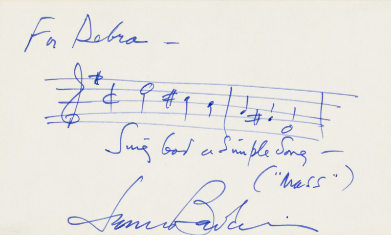 1 page, oblong 12mo (77 x 128 mm), two bars of music, hand-drawn stave, of "Sing God a Simple Song ("Mass"). [With:] Unsigned photograph, 4to.