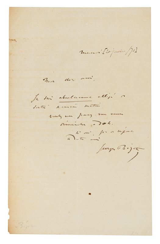 1 page, 8vo, slightly age-toned. Bizet responding to an invitation to a meeting.