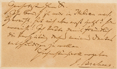 BRAHMS, Johannes (1833-1897). Autograph letter signed ("J. Brahms"), to Dr. Hartmann of the Musikhaus Gesellschaft. Frankfurt, [n.d.].