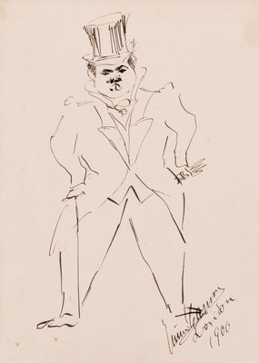 CARUSO, Enrico (1873-1921). Original drawing, self-portrait full length caricature, in pen and ink, on paper, signed and dated ("Enroco Caruso London 1906") lower right margin.