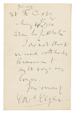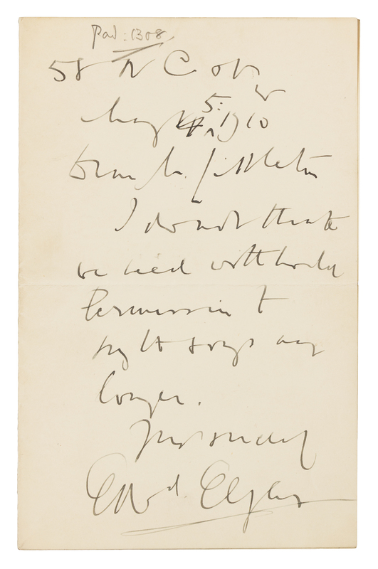 1 page, 8vo, bifolium, some light staining, creased, pencil note upper margin. Elgar writes to the Chairman of Novello Co., his music publishers: "I do not think we need to withhold permission to sing the songs any longer."
