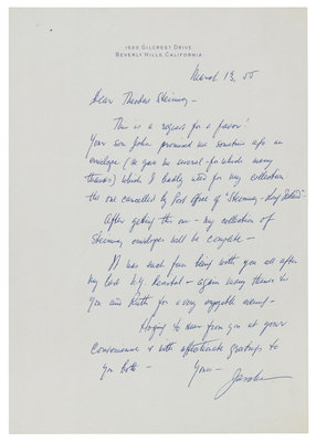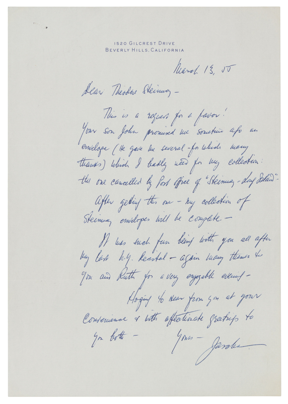 1 page, 4to, on 1520 Gilcrest Drive, Beverly Hills, California stationery, staple hole upper left corner. Heifetz inquires about an envelope he requested for his collection "the one cancelled by Post Office of 'Steinway - Long Island'," which would complete his collection of Steinway envelopes.