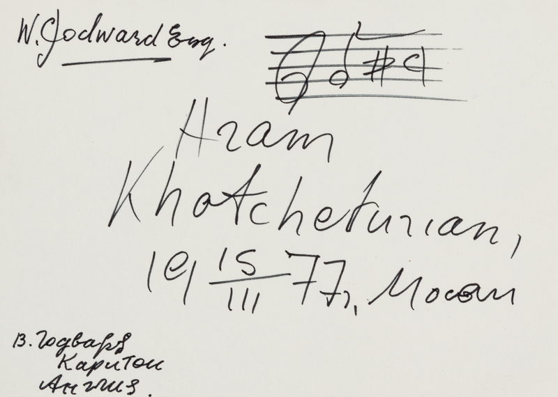 KHACHATURIAN, Aram (1903-1978). Autograph musical quotation signed ("Aram Khachaturian"), to W. Godward, Moscow, 15 March 1977.