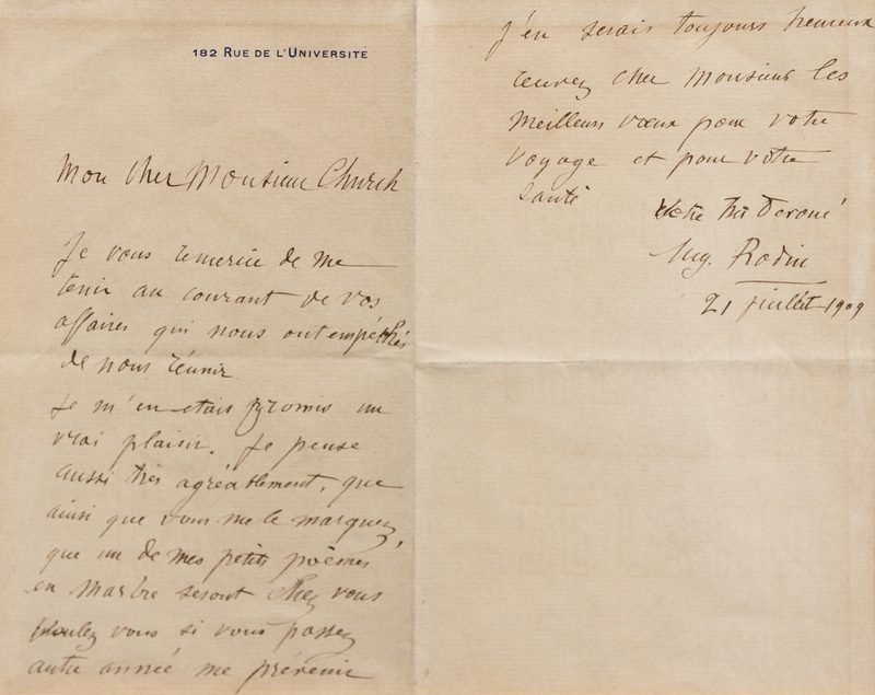 RODIN, Auguste (1840-1917). Autographed letter signed ("Aug. Rodin"), in French, to Monsieur Church, [Paris], 21 July 1909.