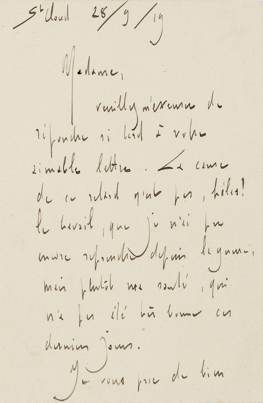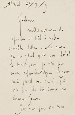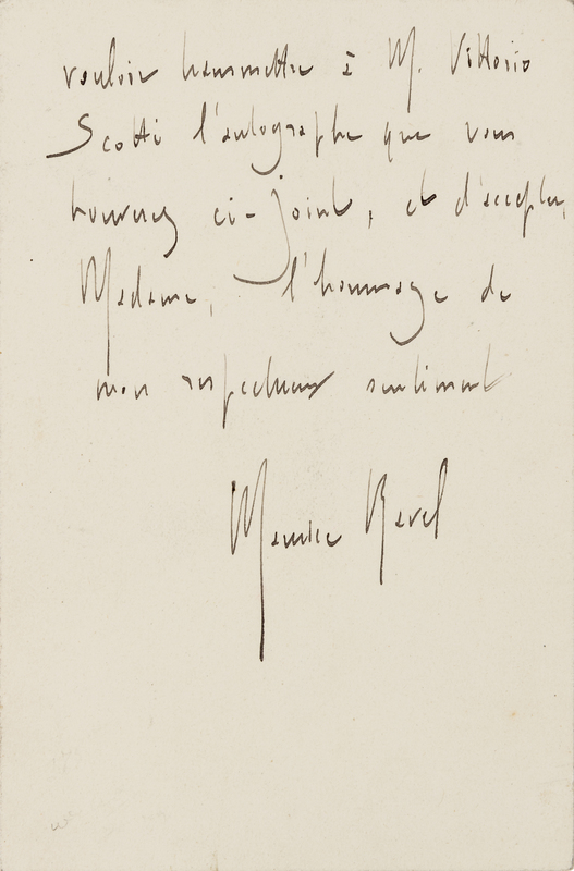 RAVEL, Maurice (1875-1937). Autograph letter signed ("Maurice Ravel") to an unnamed recipient. St. Cloud, 29 September 1919.