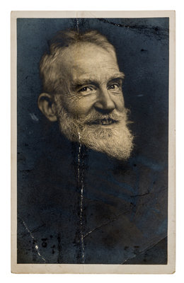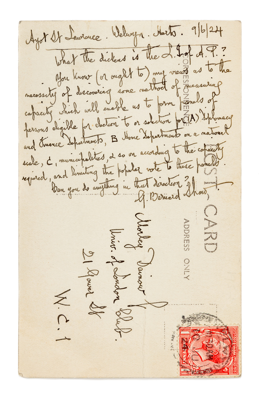1 page, 12mo postcard with Shaw's sepia-toned photograph, creased touching letters in the signature, slight surface chipping to the photograph., addressed by Shaw, some minor creasing. "You know (or ought to) my views as to the necessity of discovering some method of measuring capacity which will enable us to form panels of persons eligible for election to or selection for (A) Diplomacy and Finance Departments, B Home Departments on a national scale, C municipalities, & so on.Can you do anything in that direction?"