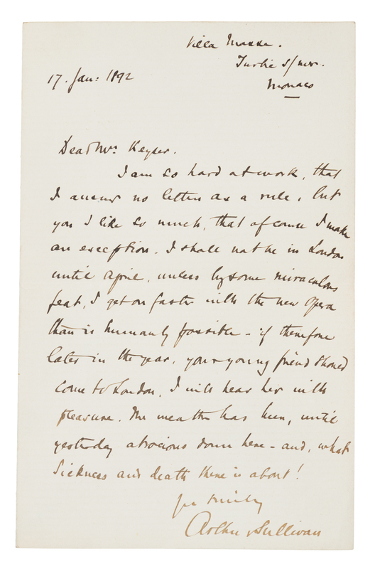 SULLIVAN, Arthur, Sir (1842-1900). Autograph letter signed ("Arthur Sullivan"), to Mr. Keynes, Monaco. 17 January 1892.
