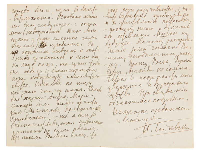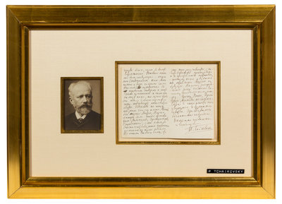 3 pages, 8vo, creased to folds; matted and framed with original holograph envelope and a postcard photograph. Tchaikovsky writes to the director and chief conductor of the Imperial theaters in St. Petersburg regarding casting for a production of an opera. "Dear Friend Eduard Frantsevich, judging by the tone of your letter it seems that you are angry with me and this makes me very unhappy. It was never my intention to irritate you about anything, but if this has happened, the it can only have been due to a hasty or poor choice of words on my part when I expressed my thoughts and feelings The whole misunderstanding lies in the fact that I had imagined the company was much richer than it is in reality. My main concern is as follows: my operas (the shortcomings of which I am fully aware and acknowledge even more strongly than anyone else) need good singers and experienced actors; and if these people are not presently available, then it is better to delay the performance of the opera until they are available. I am not looking for perfection, as I know this does not exist. If there had been actors like Meljnikov, Pryanishnikov and Stravinsky [father of Igor] for the parts of Audrey, Maria and the mother I would have been quite happy, although even these actors are not ideal. From your letter I can see that you have already begun to rehearse the choirs, and since you have already started work on the set, we will not be able to postpone Mazeppa until a future date. I am therefore going to assign the roles according to your letter of today We will discuss this in more detail when we meet"The Czech conductor and composer Npravnk (1839-1916) settled in Russia and is best known for his leading role in Russian musical life as the principal conductor of the Imperial Mariinsky Theatre in Saint Petersburg for many decades. In that capacity, he conducted the premieres of many operas by Russian composers, including those by Mussorgsky, Tchaikovsky and Rimsky-Korsakov.The opera Mazeppa was composed between June 1881 and April 1883. The libretto was based on Poltava, a narrative poem by Alexander Pushkin.The premiere performance took place on 15 February 1884 at the Bolshoi Theatre in Moscow, and four days later it premiered in St. Petersburg at the Mariinsky Theatre conducted by Eduard Npravnk. Tchaikovsky's concerns were not unfounded as in both performances, the work was brilliantly staged but marred by the uneven vocal and acting abilities of the cast.