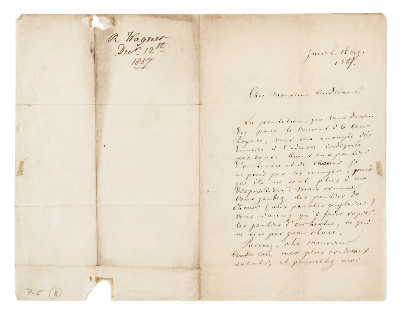 1 1/2 pages, 4to, written on recto and verso of a bifolium, a few minor stains, creased at folds, docketed by recipient on verso of blank integral leaf, some loss from seal not affecting text. Wagner promises the conductor of the Queen's private band the score for a concert at the Royal Court, but regrets that he can only send the choral parts, as he no longer has the orchestral score.