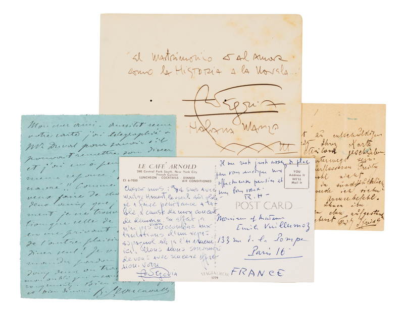 KREISLER, Fritz (1875-1962). Autograph letter signed ("Fr. Kreisler"), to his manager Arnold Rose, n.p., n.d. 1 page, 12mo. The violinist tells his manager that the fee should be on the way, and addressing the accusation that he did not play in Vienna the previous Friday ("The accusation...is presumably not serious. It rained and stormed in biblical proportions.") -- LEONCAVALLO, Ruggiero (1857-1919). Autograph letter signed ("R. Leoncavallo"), in French, to an unnamed recipient, n.p., n.d. 1 page, 12mo, creased. The sender apologizes that he cannot make a dinner engagement. -- SEGOVIA, Andres (1893-1987). Autograph letter signed ("A. Segovia"), in French, to an unnamed recipient, New York, n.d. 1 page, oblong 8vo, on Le Caf Arnold postcard, hand-addressed. Segovia reports he is with Maestro Hauert for dinner, having picked this restaurant because he refused to eat a Spanish meal. -- SEGOVIA, Andrs (1893-1987). Autograph quotation signed ("Andrs Segovia"), Havana, March 1933. 1 page, 8vo, a few pale stains. In full: "Marriage is to love, like history is to the novel." -- Together, 4 manuscripts.