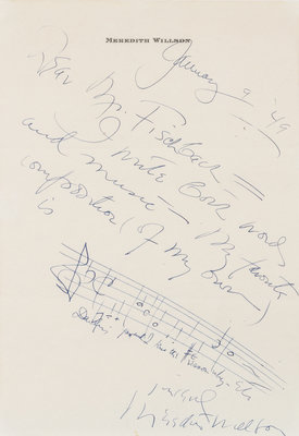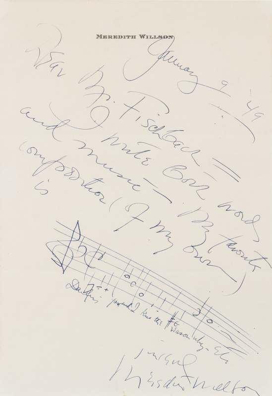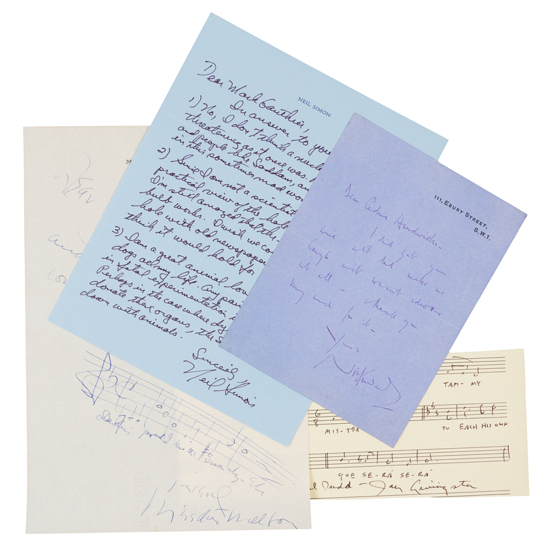 COWARD, Nol (1899-1973). Autograph letter signed ("Nol Coward"), to Cedric Hardwick, London, n.d. 1 page, 8vo, on blue 111, Ebury Street stationery. Coward thanks Hardwck for the wire "which did make me laugh which wasn't idiotic at all." Coward lived at 111, Ebury Street in Belgravia from 1917 to 1930 while writing his early plays. [With:] Portrait photograph of Coward. -- LIVINGSTON, Jay (1915-2002). Autograph musical quotation signed ("Jay Livingston"), to Michael Judd, n.p., n.d. 1 page, oblong 8vo, with 8 quotations on cut printed staves. Including bars from: "Silver Bells," "Buttons and Bows," "Tammy," "Bonanza," "Mister Ed," "To Each his Own," "Mona Lisa," and "Que Sera Sera." -- SIMON, Neil (b.1927). Autograph letter signed ("Neil Simon"), to Mark Gauthier, n.p., n.d. 1 page, 4to, on personal stationery. Simon responds to a fan's letter, and writes about nuclear war, North Korea, Saddam Hussein, and the hole in the ozone layer. -- WILLSON, Meredith (1902-1984). Autograph letter signed ("Meredith Willson") and musical quotation, to John A. Fischbach, [Los Angeles], 9 January 1949. 1 page, 4to, on personal stationery,with type-addressed envelope, lightly creased, tiny pin hole. Willson writes "both words and music," and includes 5 bars on a handwritten stave: "Darling - you and I kno the reason why" which he calls "my favorite composition (of my own)." -- Together, 4 manuscripts.