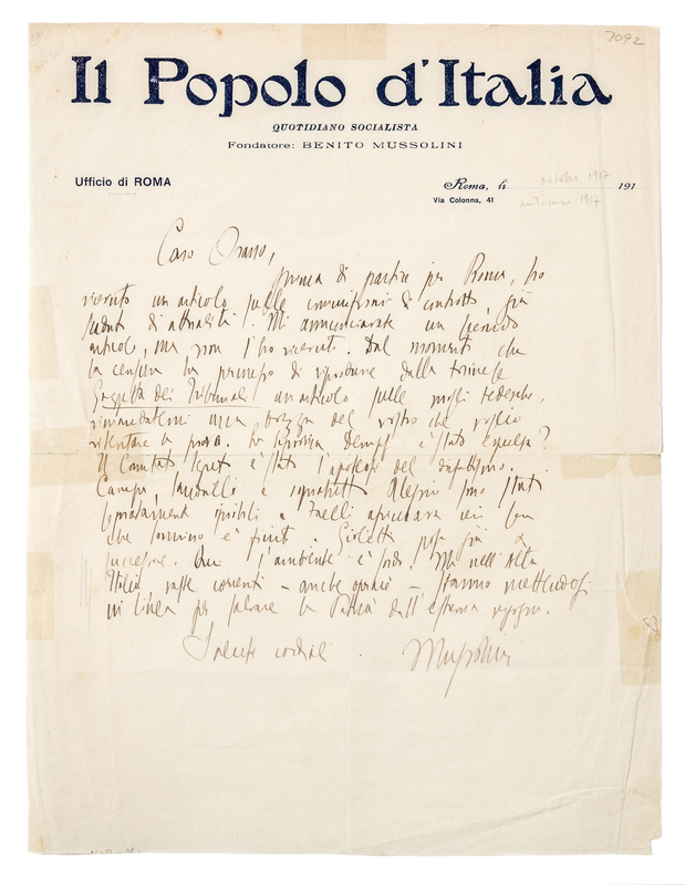 1 page, 4to, on Popolo d'Italia letterhead, some cello-tape repairs on verso with show-trhough affecting a few words, creased and nicked at edges, some separation at folds, tear on right edge. A rare early Mussolini letter to his early associate Paolo Orano, requesting various articles and proofs "as soon as the censor permitssend me a proof of yours" He goes on to report on the current political situation in Italy: "The secret committee was the apotheosis of defeatism. Canepa, Sandulli and particularly Alessio were in particular ignoble and Faelli assured me yesterday that Sonnino was finished. Giolitti already settled on a successor. Here the atmosphere is dull. But in northern Italy, the strong currents-even working class-are putting themselves on the line to save the country from extreme shame" Paolo Orano (1875-1945) was an Italian psychologist, politician and writer who began his political career as a revolutionary syndicalist in the Italian Socialist Party. He later became a leading figure within the National Fascist Party. During the March on Rome he served as Mussolini's chief of staff, while occupying a seat on the Grand Council of the party. He enjoyed a high-profile under the fascist government, serving in the parliament and holding the post of rector of the University of Perugia.Paolo Orano (1875-1945) was an Italian psychologist, politician and writer who began his political career as a revolutionary syndicalist in the Italian Socialist Party. He later became a leading figure within the National Fascist Party. During the March on Rome he served as Mussolini's chief of staff, while occupying a seat on the Grand Council of the party. He enjoyed a high-profile under the fascist government, serving in the parliament and holding the post of rector of the University of Perugia.