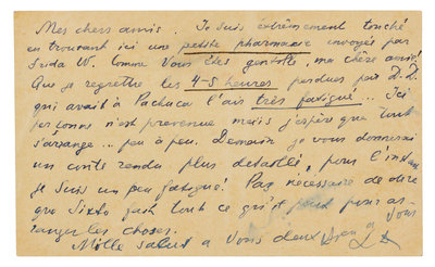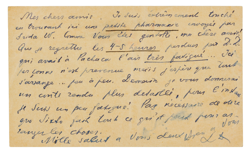 1 page, 12mo (85 x 140 mm), with holograph address on verso, age-toned, small dampstain affecting one word. Trotsky sends his greetings and thanks Frida for sending him some medicine ("une petite pharmacie"). He promises a fuller update after he is settled the next day, and signs with his initials after his real name, Lev Davidovich Bronstein.