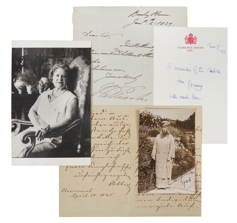 ALBERT, Prince Consort of Victoria of England (1819-1861). Autograph letter signed ("Albert"), in German, to "His Royal Highness," Claremont, 28 April 1845. 4 pages, 8vo, two bifolium, some browning and staining. Writing from Claremont, the English residence of King Leopold of Belgium (who was both Victoria and Albert's uncle), Prince Albert sends updates about future King Edward VII ("The little gentleman whom you saw baptized here is growing up and in best health", translated), and thanks the recipient for sending a gift. -- ELIZABETH, Queen of George VI of England (1900-2002). Autograph note, to David, Viscount Linley, London, 7 June 1977. 1 page, 8vo, on Clarence House stationery, central fold. "A reminder of the Jubilee from Granny with much love." -- GEORGE V, King of England (1865-1936). Partially printed document signed ("George R.I."), St. James, 19 May 1928. 1 page, folio, prominent central fold. An appointment of Bernard Gottleib as Counsel at Wellington. -- MARY, Queen of George V of England (1867-1953). Postcard signed ("Mary R."), 1926. 1 page, 12mo. Photographic depiction of the Queen in a garden, wearing a three-quarter length coat embroidered with a Turkish motif, and a turban-style hat, signed on recto with a handwritten note on verso thanking the recipient for a gift. -- VICTORIA, Queen of England (1819-1901). Autograph note, to Mr. J. Campbell, Windsor Castle, 29 November 1875. 2 pages, bifolium, on black-bordered Windsor Castle stationery, a few pale stains and creases. The Queen thanks the recipient for the beautiful screen from Japan, which she will place in Windsor Castle with other fine objects from the East. -- WILLIAM IV, King of England (1765-1837). Autograph letter signed ("William"), as Duke of Clarence, to an unnamed recipient [Sir Francis Freeling], Bushey House, 4 January 1829. 1 page, 4to, note in a different hand lower margin identifying both sender and recipient, creased, a few pale stains. The sender says he "will thank you to forward the three enclosed letters to their destinations in India." -- Together, 6 manuscripts.
