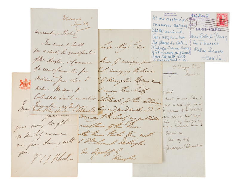 CHURCHILL, Randolph Henry Spencer, Lord (1849-1895). Autograph letter signed ("Randolph Churchill"), to Sir Daniel Gooch, London, 20 March [1883]. 1 page, 8vo on 2 Connaught Place stationery (address crossed out). Churchill writes: "with reference to the Woodstock Railway, whenever you are kind enough to drop me a line...and have a moment's leisure to receive me." -- PEEL, Robert, Sir (1788-1850). Autograph letter signed ("Robert Peel"), to the Bishop of London, Whitehall, 24 June no year. 1 page, 8vo, integral blank leaf, creased, small clear mounting corners to blank area. Writing about the qualifications of Mr. Douglas on the news of Archdeacon Jones' request for an early resignation. -- RHODES, Cecil John (1853-1902). Autograph letter signed ("C.J. Rhodes"), to Sir James Sivewright, n.p., n.d. 1 page, 8vo, integral blank, with note from the recipient on verso. Rhodes writes "Jameson goes away tonight so kindly excuse me from dining with you." Sivewright notes, "I will as him for tomorrow-night. He is not in this afternoon. Jim." -- WELLINGTON, Arthur Wellesley, 1st Duke (1769-1852). Autographed letter signed ("Wellington"), to Jos. Wagstaff, London, 5 May 1821. 1 page, 4to, folds, one touching signature, a few pale stains or light soiling, left edge chipping. Thanking the recipient for the invitation to join the Pitt Club of Warrington. -- WINDSOR, Wallis Simpson, Duchess of (1896-1986). Autograph note signed ("W"), to Anita O'Keeffe Young, Tucson, Arizona, [5 March 1956]. 1 page, 12mo, on verso of printed postcard of the Arizona Inn, addressed in the Duchess's hand. The Duchess writes Anita O'Keeffe Young, the sister of artist Georgia O'Keeffe, who is staying in Palm Beach. -- Together, 5 manuscripts.