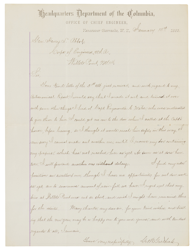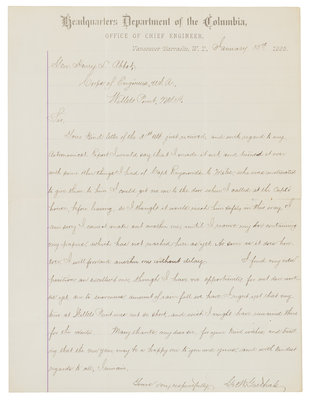 GOETHALS, George W. (1858-1928). Autograph letter signed ("G.W. Goethals"), to General Henry L. Abbott. Washington Territory, 15 January 1883.