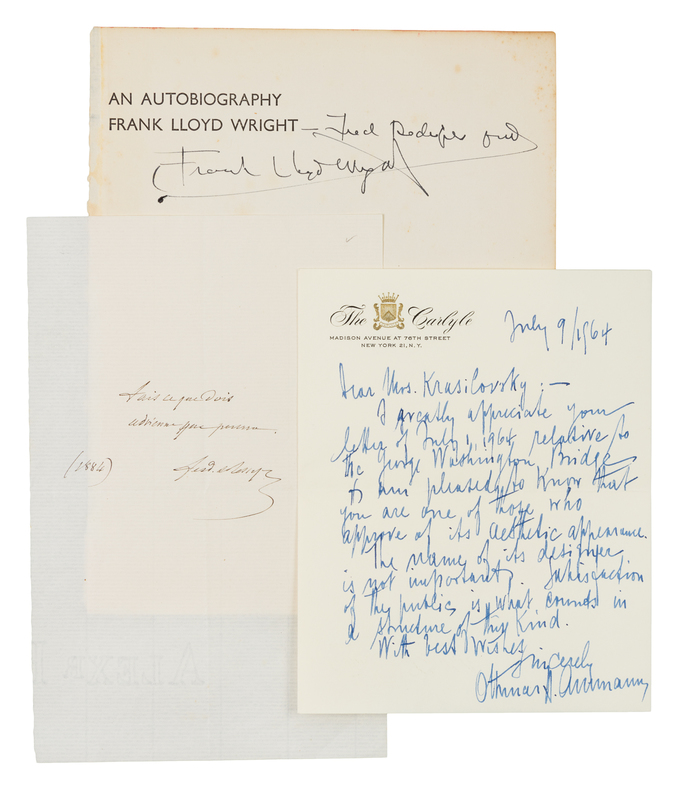 AMMANN, Othmar (1879-1964). Autograph letter signed ("Othmar Ammann"), to Mrs. Krasilovsky, New York, 9 July 1964. 1 page, 8vo, on The Carlyle Hotel stationery. Ammann, the engineer of suspension bridges including the George Washington Bridge, the Golden Gate Bridge, and the Verrazano Narrows Bridge, thanks the recipient for her approval of the appearance of the George Washington Bridge: "The name of its designer is not important. Satisfaction of the public is what counts on a structure of this kind." -- LESSEPS, Ferdinand, Viconte de (1805-1894). Autograph quotation signed ("Ferd de Lesseps"), in French, n.p., 1884. 1 page, 8vo. Translated, reads: "Do what you have to, come what may." -- WRIGHT, Frank Lloyd (1867-1959). DS ("Frank Lloyd Wright"), n.p., n.d. 1 page, 4to, on the title-page from his 1932 work "An Autobiography." "Fred Pedifer from Frank Lloyd Wright. -- Together, 3 manuscripts.