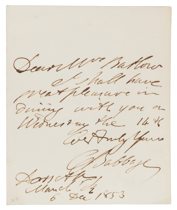 1 page, 12mo (113 x 93 mm). Babbage accepts a dinner invitation ("I shall have great pleasure in dining with you...").