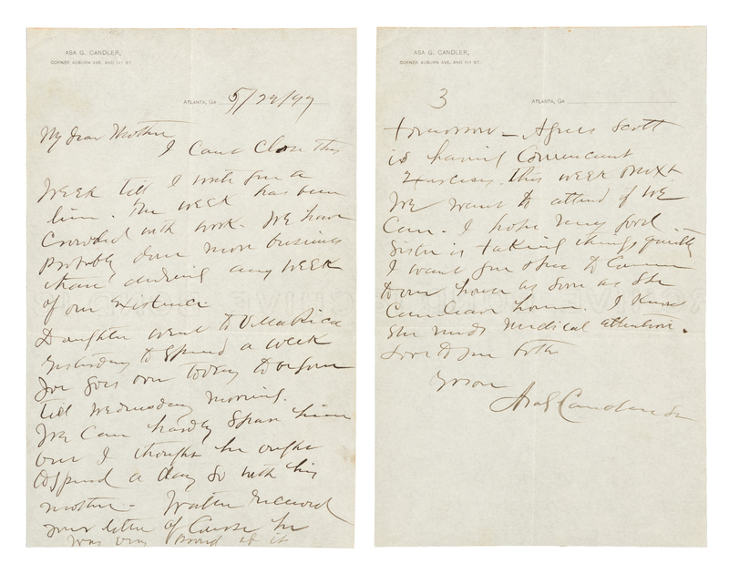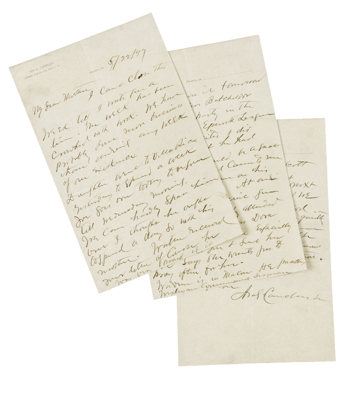 CANDLER, Asa Griggs (1851-1929). Autograph letter signed ("Asa G Candler"), to his mother. Atlanta, 22 May 1897.