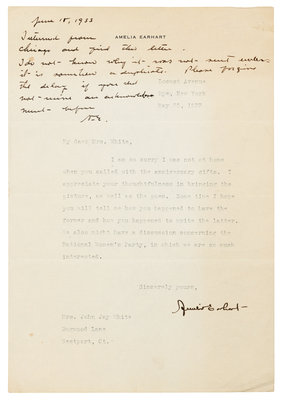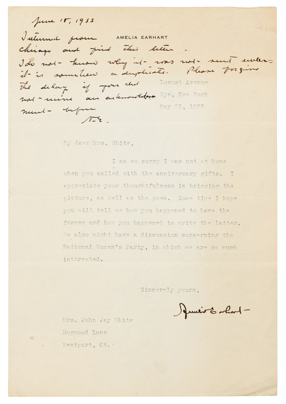 EARHART, Amelia (1897-1937). Typed letter signed ("Amelia Earhart"), to Mrs John Jay White. Rye, New York, 25 May 1933.