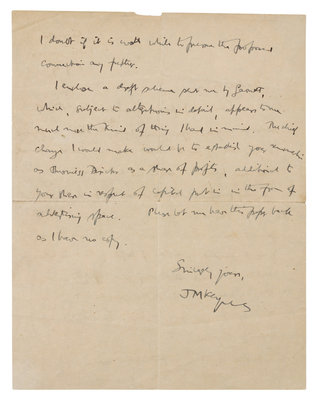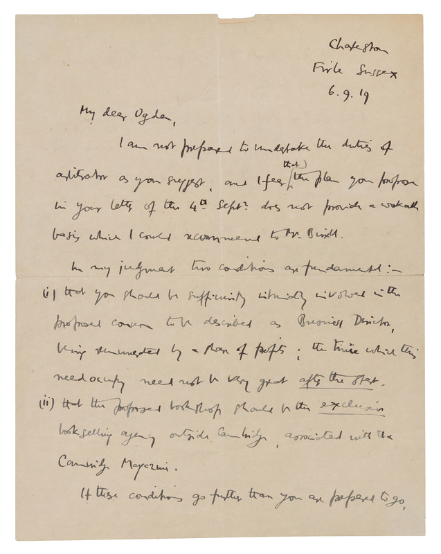 2 pages, 8vo, creased at folds, 3-inch marginal separation at fold. Keynes writes his friend and fellow Heretic Society member regarding his Cambridge Magazine Bookshop venture. "My dear Ogden, I am not prepared to undertake the duties of arbitrator as you suggest, and I feel that the plan you propose in your letter of the 4th Septr does not provide a workable basis" He continues to outline fundamental conditions for a successful business, including "that the proposed bookshop should be the exclusive bookselling agency outside Cambridge, associated with the Cambridge Magazine"