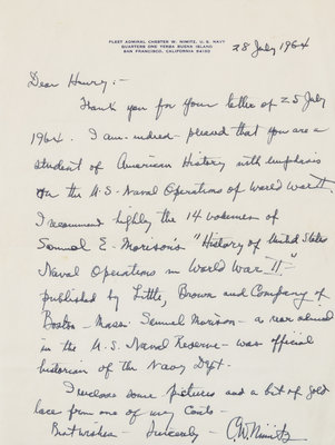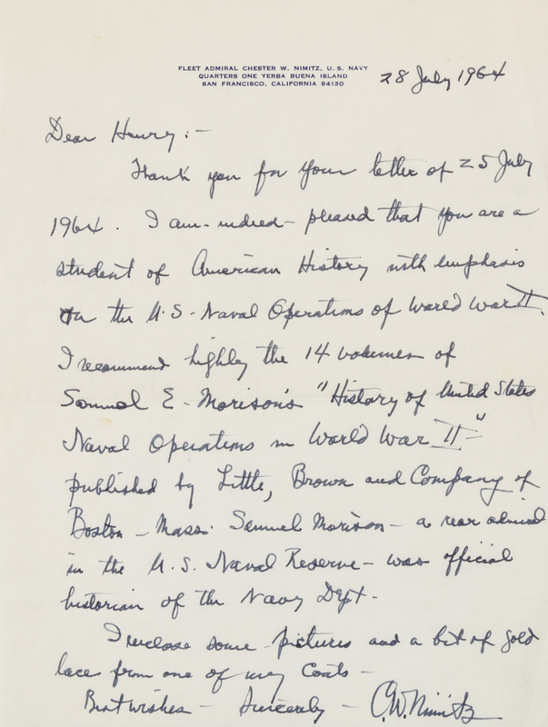 NIMITZ, Chester W. (1885-1966). Autograph letter signed ("C.W. Nimitz"), to Henry. Yerba Buena Island, San Francisco, 28 July 1964.
