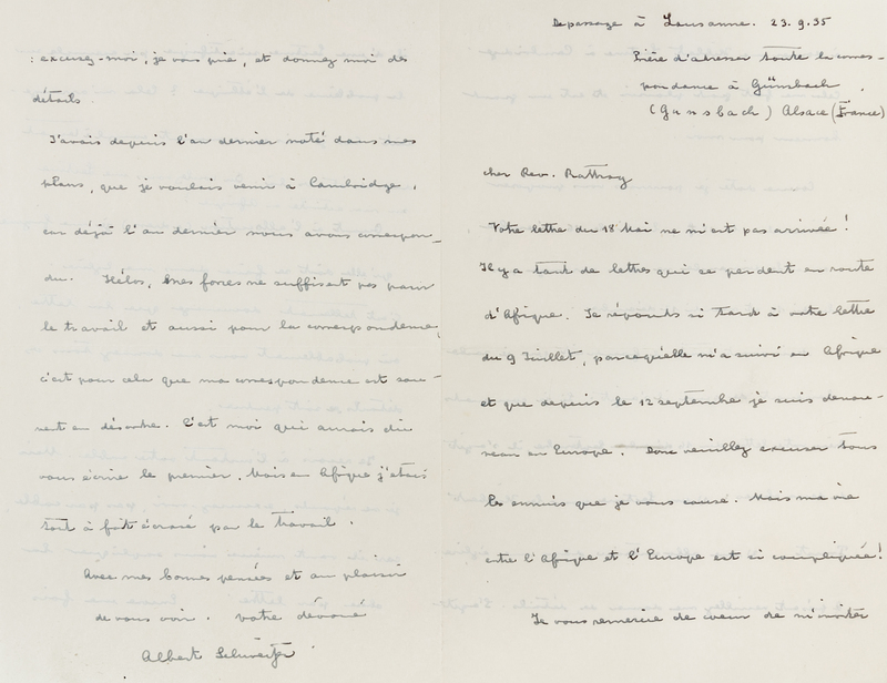 SCHWEITZER, Albert (1875-1965). Autograph letter signed ("Albert Schweitzer"), to Reverend R.F. Rattray. Lausanne, Switzerland, 23 September 1955.