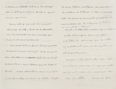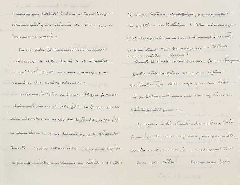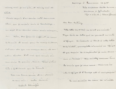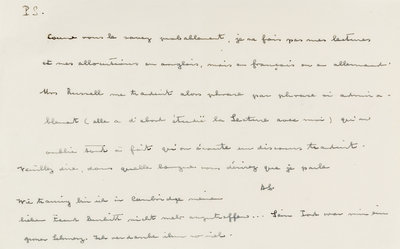 5 pages, 8vo, bifolium and one half sheet, with original envelope. Responding to an invitation to give the Hibbert Lecture at Cambridge University, and commenting that he only lectures in French or German. He expresses grief over the death of his dear friend Professor Burkitt in Cambridge: "His death deeply grieved me. I owe him so much."