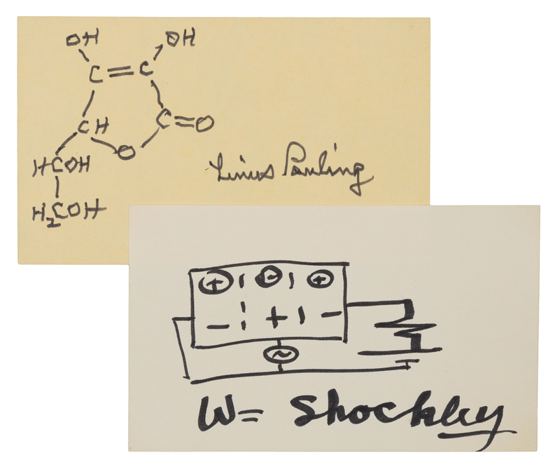 PAULING, Linus Carl (1901-1995). Autograph chemical formula signed ("Linus Pauling"), n.p., n.d. 1 page, 12mo, on a card. Handwritten formula from his work in chemical bonding for which he was awarded one of his two Nobel Prizes. [With:] SHOCKLEY, William (1910-1989). Original diagram of a transistor signed ("W. Shockley") on a 3x5" card, n.p., n.d. 1 page, 16mo. Shockley, a solid-state physicist, invented the transistor and was influential in early Silicon Valley.