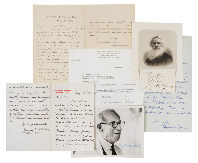BARTON, Clara (1821-1912). Autograph letter signed ("Clara Barton") to an unnamed recipient, Oak Park, IL, 15 May 1910. 1 1/4 pages, 8vo, a few holes, one touching a letter, a few pale stains. Barton discusses her travels ("I am getting to be almost as remarkable a traveller as T.R."), and her desire to return home to Glen Echo. -- MORSE, Samuel F.B. (1791-1872). Clipped signature ("Respectfully Yr Ob Servt Saml. F.B. Morse"). 1 page, 16mo, laid down on slightly larger sheet, minor vertical fold touching the "S" in signature. [With:] Printed portrait of Morse. -- SPOCK, Benjamin (1903-1998). Autograph letter signed ("Benjamin Spock"), to Mr. Hunt, Falmouth, Massachusetts, n.d. 1 page, 4to, on Quinsett Harbor House stationery, pencil notations upper margin. "Redbook wants my child rearing piecesI want to save my ideas for this column. Occasionally I'm bursing with a non-nursery theme...but other publications are less interested." [With:] TLS ("Benjamin Spock"), to Robert Johann, New York, 4 December 1967. 1 page, 4to, on personal stationery. Regarding the New Politics Convention in Chicago. [With:] Photograph signed lower margin. -- STANLEY, Henry Morton, Sir (1841-1904). Autograph letter signed ("Henry M. Stanley"), to an unnamed recipient, Whitehall, 6 May 1896. 2 pages, 8vo, bifolium, on Richmond Terrace, Whitehall stationery. Stanley writes about a conflict with future dinner plans; he has to attend the Transvescal Debate that evening as a debate participant. -- Together, 4 manuscripts.