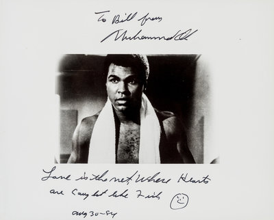 8 x 10 in., black & white photo port of Ali from the film The Greatest. Inscribed above image "To Bill from Muhammed Ali" and below image "Love is the net, where Hearts are caught like Fish [happy face doodle] Aug 30-84".