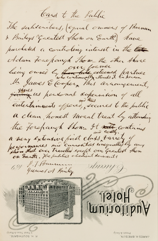 1 page, 8vo, on Auditorium Hotel stationery (inverted), James A. Bailey's name added in Barnum's hand, with several revisions and corrections, creased, tiny pin hole lower margin. Announcing Barnum and Bailey's new controlling interest (along with James E. Cooper) of a rival circus, the Adam Fonepaugh Show.