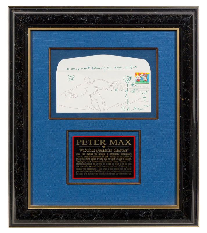 On standard business envelope with 1974 Expo stamp designed by Max on first day of issue, signed lower right. Matted and framed.