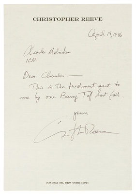 REEVE, Christopher (1952-2004). Autograph note signed ("Christopher Reeve"), to Charles Melniher. New York, 19 April 1986.