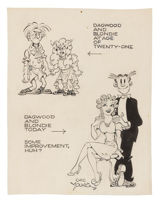 275 x 214 mm. A "then and now" cartoon drawn for publication of his famous characters, depicting "Dagwood and Blondie at age of twenty-one," and "Dagwood and Blondie today," with the comment "Some improvement, huh?"