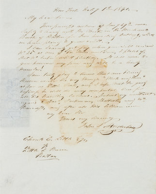 1 page, 4to, glue stain on verso on verso showing through at center and crossing portion of signature, portion of sheet reinforced along left margin on verso with some show-through, creased at folds. Acknowledging receipt of payment for $200 and reporting: "I can scarcely yet say when you will receive No. 25 as one of the Stories containing 2 plates of that No. broke while printing-It will come to you however very soon and will be a lovely Number!" He mentions Little's partner salesman James Brown's progress through the South and sends his hopes "that the grand business he will do may compensate him for all his traveling labours." The letter concludes sending his regards to his Boston friends associated with his own project: Dr. George Parkman, Dr. George Shattuck and George Bancroft. At the time of this letter, Audubon was working on his revised, smaller-format version of his great work, The Birds of America, but the subscription referred to here seems more likely to relate to the double elephant edition. The Little, Brown & Co. copy containing 102 individual plates plus the title page for the first volume and two duplicate plates was purchased by the Boston Public Library in Dec. 1875.