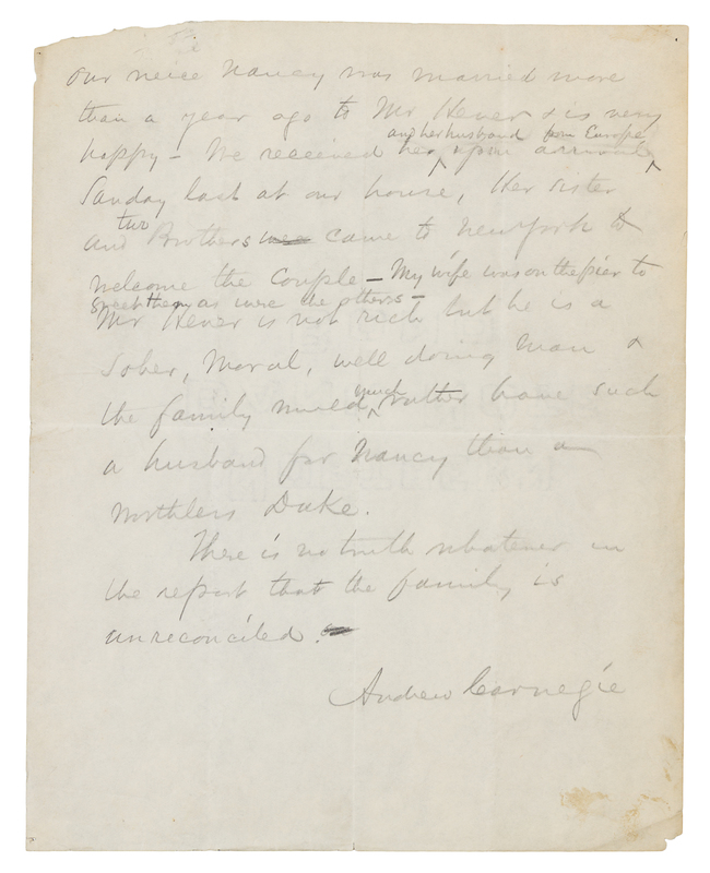 1 page, 4to, folds touching signatures, a few small chips to upper left and lower right corners, a few pale stains. Carnegie discusses the secret marriage of his niece Nancy to coachman James L. Hever. "We receved her and her husband upon arrival from Europe Sunday last at our house, Her sister and two Brothers wen came to New York to welcome the couple - My wife was on the pier to greet them as were the others. Mr Hever is not rich but he is a sober, moral, well doing man & the family would much arther have such a husband for Nancy than a worthless Duke. There is no truth whatever in the report that the family is unreconciled."
