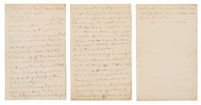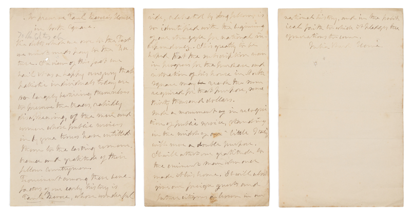 2 1/4 pages, 8vo, two holes in the same location all three pages just touching a few letters, one hole second leaf, a few pale stains, creased. Julia Ward Howe, author of The Battle Hymn of the Republic, writes to the editors of The Transcript in support of the fight to save Paul Revere's home in Boston: "The debts which we owe to the Past we mustpay to the futureProminent among these benefactors of our early history is Paul Revere, whose wonderful ride, celebrated by Longfellow, is so identified with the beginning of our struggle for national independence." In part through the efforts of Howe, money was raised by the public to form the Paul Revere Memorial Association, still in existence today. In 1908, Revere's house at 19 North Square was opened as one of the nation's first historic house museums.