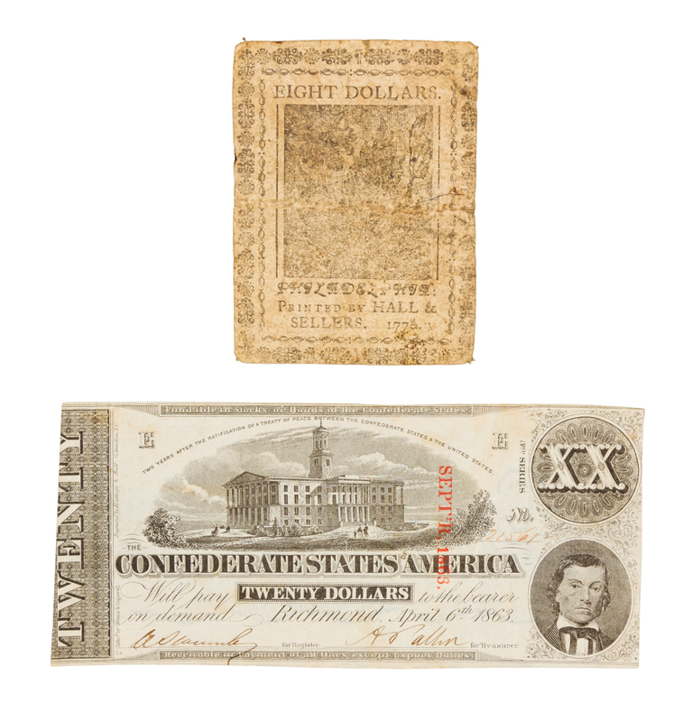 [CONTINENTAL CURRENCY]. Eight dollar bill issued 17 February 1776. Hand-signed with an eagle vignette on front. Printed by Hall and Sellers. -- [CONFEDERATE CURRENCY]. Twenty dollar bill issued 1883. Hand-signed and numbered "No.21561". Original cut from sheet on left side of note touching three letters. -- [ENRON]. One share original Enron Corp. Common Stock, 31 March 2004, facsimile signatures lower margin. -- [ENRON]. One share original WorldCom Common Stock, n.d., facsimile signatures lower margin. -- Together, 4 items.