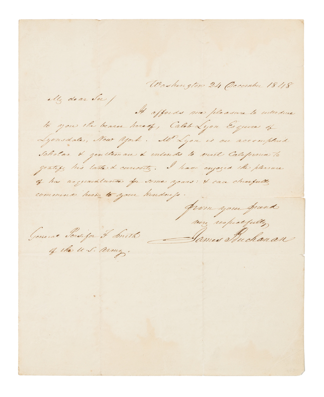 1 page, 4to, faint staining, minor nicking at upper and right edges at folds, short tear to center fold. Buchanan sends a letter of introduction to Persifor F. Smith, commander of the Pacific Division of the United States Army after the Mexican War. The introducee, Caleb Lyon, was appointed U.S. Consul at Shanghai by President Polk in 1847. In 1848, he resigned the post to go to California, where gold had just been discovered; there, he was chosen secretary of the state of California's Constitutional Convention of 1849.