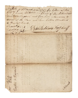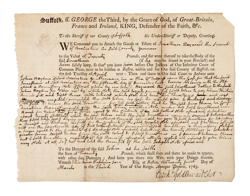 1 page, 4to, some browning and separation at folds, some chipping at corners, left edge irregular. Docketed on verso including notes for expenses for serving the writ, signed by Adams's younger brother Peter B. Adams (1738-1823) as Deputy Sheriff.An early legal document concerning the estate of Jonathan Hayward of Braintree and sums owed to Jonathan Hayward with extensive manuscript additions by John Adams (c.300 words). Following his graduation from Harvard College in 1755, Adams returned to Braintree (now Quincy) to launch his law practice where he married Abigail Smith of Weymouth on 25 October 1764. For several years the Adamses moved their household between Braintree and Boston as warranted by John's successful law practice and the demands of the circuit court system. The present document sheds light on the local legal activities the young Adams was diligently engaged in during his early career, prior to his rise to prominence when he successfully defended the British soldiers charged in the Boston Massacre Trials.
