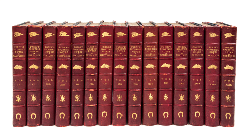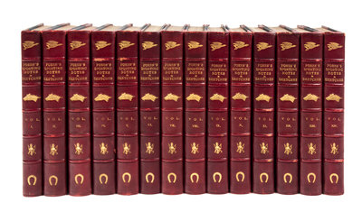29 volumes, 8vo (221 x 145 mm). Approximately 928 plates after Finch Mason, R.M. Alexander, Cuthbert Bradley, and others. Uniformly bound in half red morocco, blue cloth-covered boards, spines in 6 compartments with 5 raised bands, gilt-lettered in two, the rest with single sporting tools (a duck; a horse's head; a hunting trophy comprising crossed whips, a fox's brush and a riding hat; and a horseshoe), top edge gilt, others uncut (some overall light wear, slight bend to a few boards). THE DUKE & DUCHESS OF WINDSOR COPY. A FINE COMPLETE SET. Schwerdt had only volumes I-XXVII. See Schwerdt I, p.180.