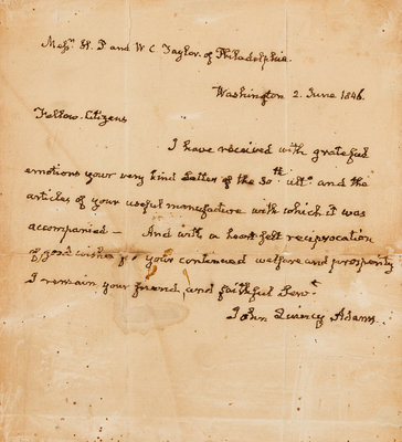 ADAMS, John Quincy (1767-1848). Autograph letter signed ("John Quincy Adams"), to H. P. and W. C. Taylor of Philadelphia. Washington, D.C., 2 June 1846.