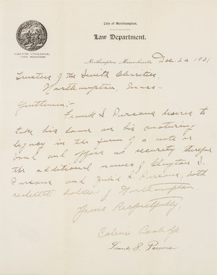 1 page, 4to, on City of Northampton Law Department stationery, also signed by Frank S. Parsons lower margin, thumb mark lower left margin. Authorizing Frank S. Parsons to take a loan on his maturing legacy in the form of a note or a bond.