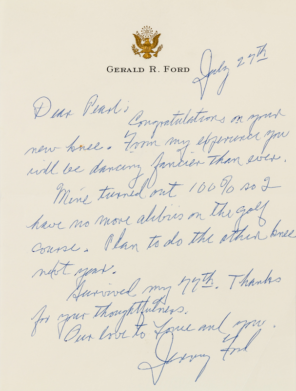 1 page, 8vo, on personal stationery bearing the Presidential seal, diagonal crease lower right corner. Ford writes to American actress and singer Pearl Bailey: "Congratulations on your new knee. From my experience you will be dancing fancier than ever. Mine turned out 100% so I have no more alibis on the golf course." Bailey, well known playing the lead in the musical "Hello, Dolly," supported Ford in the 1976 election, voiced her support in a commercial for Ford during the election.