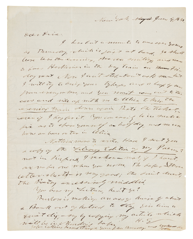 1 page, 4to, on lined paper, lightly browned, a few short nicks at creases. Greeley makes plans for a friend to meet him on a train passing through Herkimer so he can return his friend's types. He also comments on current affairs: "Thurlow is making an ass of himself about a Bank out of hatred to Clay. Give him a quiet dig."